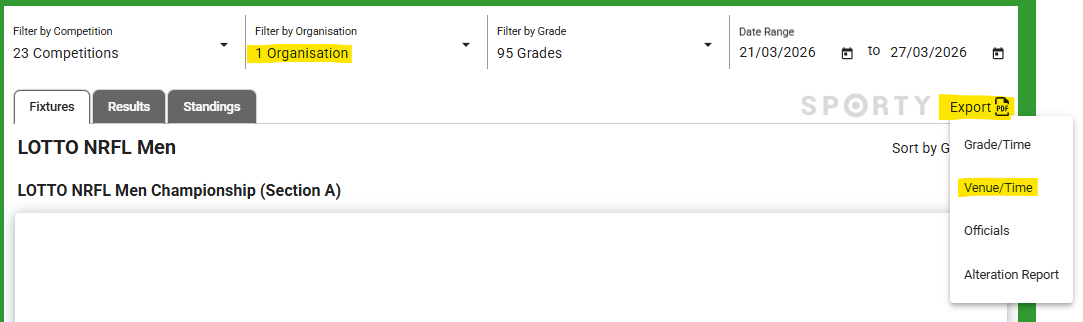 When viewing the page, click Export, then select which export option e.g. Venue/Time