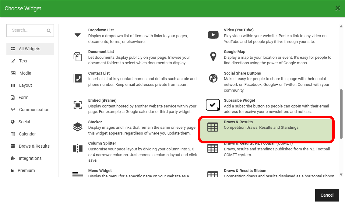 Select the Draws & Results widget
